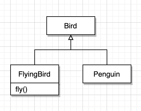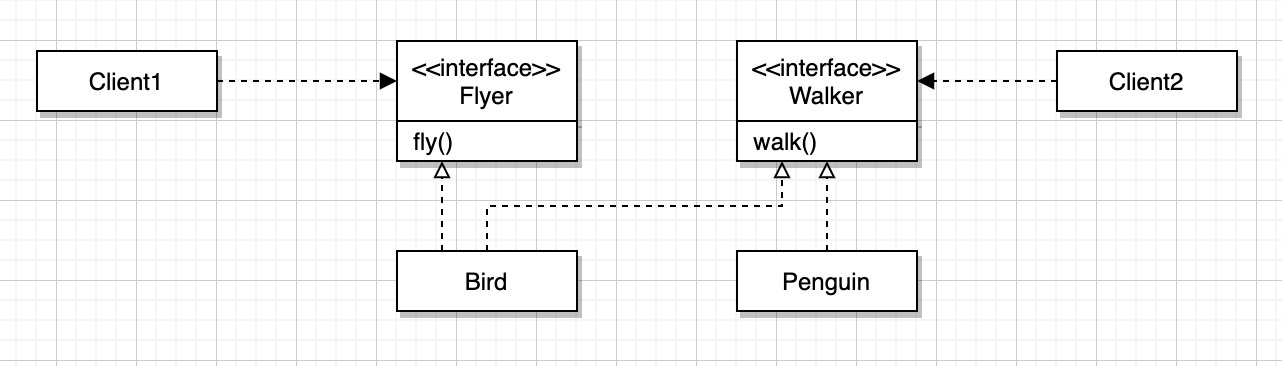이제 Bird와 Penguin은 자신이 수행할 수 있는 인터페이스만 구현할 수 있다.