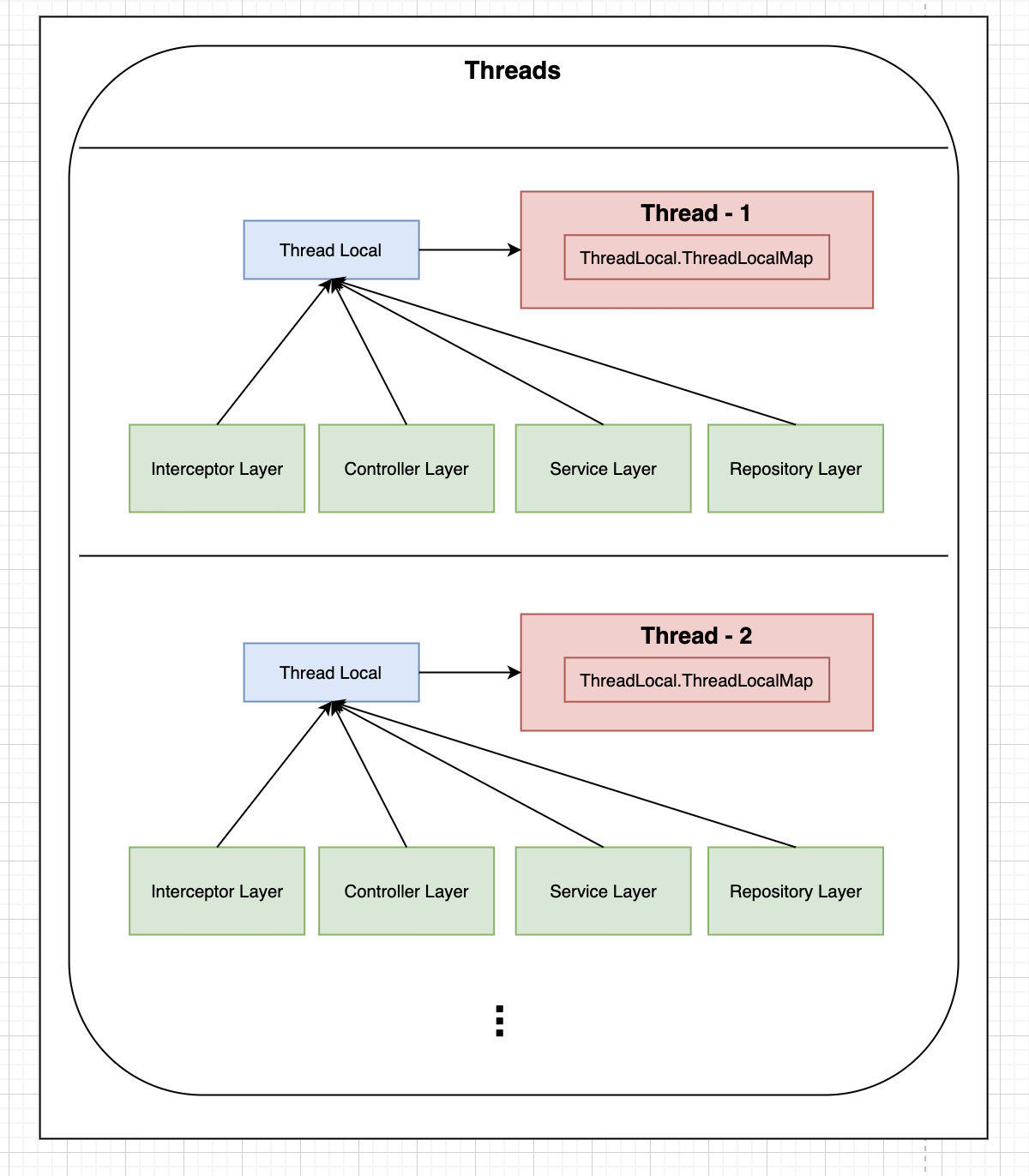 ThreadLocal.ThreadLocalMap threadLocals = null; //Thread 한정 모든 Layer에서 ThreadLocal를 통해 접근할수 있게 참조 변수 선언.